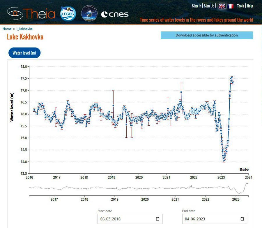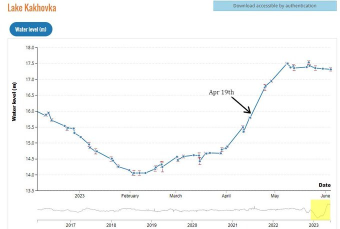 Note the date: May 4th of this year. Videos began to show that the Kakhovka reservoir was dangerously rising at that time. And several scientific charts prove it:
