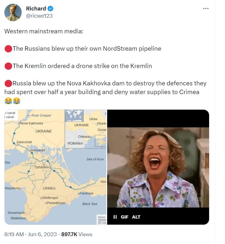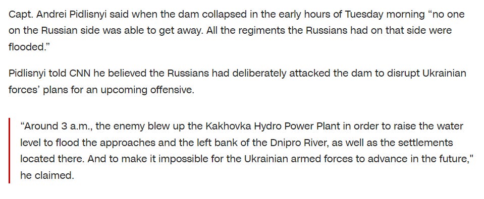 And note how nonsensical Ukraine’s explanations are. A Ukrainian officer in this CNN article literally said in the same breath that Russia blew up the dam, yet also gloated how many Russian troops were washed away (implying they were killed) by the flood and that it destroyed many Russian troop positions. Does he not see the illogicality of that statement? So Russia blew up its own dam without informing its troops and got them all killed? It’s worthy of a facepalm.