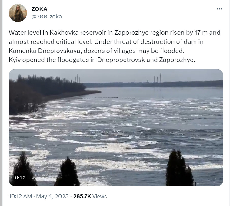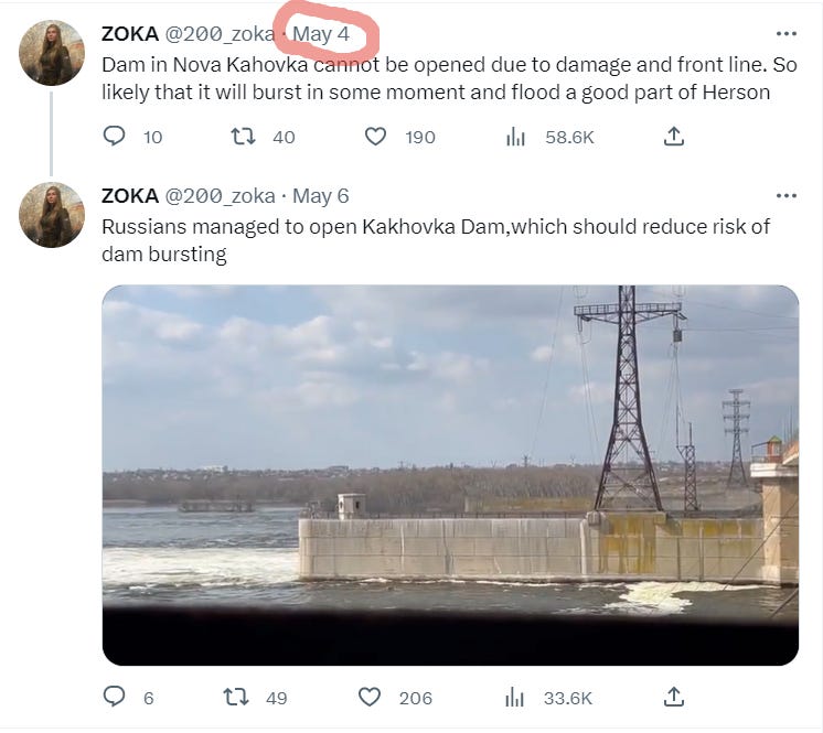 As you can see, he states that Russia was unable to open the dam to relieve the pressure due to the dam locks having suffered previous damage from Ukrainian strikes. So Zoka predicted a month ago the dam would soon collapse.
