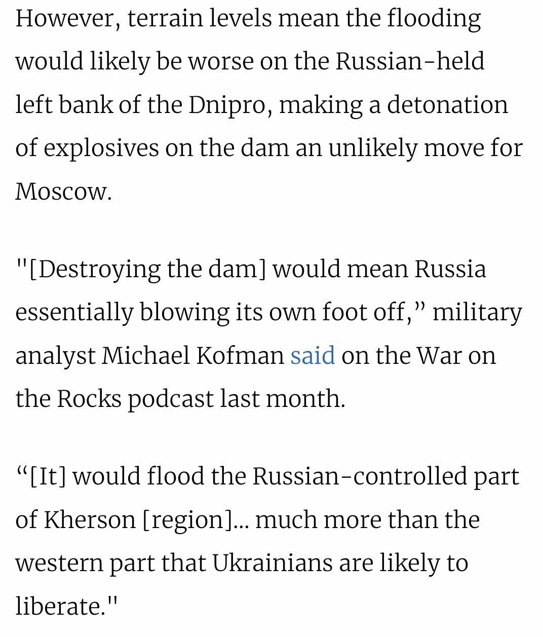 Furthermore, let’s hold to account the Western and Ukrainian ‘experts’ who also were caught previously admitting that Russia would be ‘shooting itself in the foot’ by destroying the dam, and had nothing to gain by it. Here is the infamously offbase Michael Kofman’s take in a Moscow Times interview from November last year: