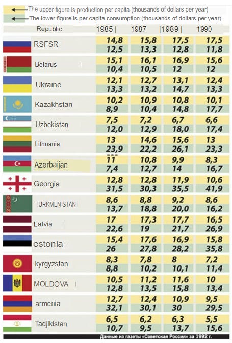 Note how, as the ‘80s wore on, Russia’s ratio of production over consumption grew more and more net positive into surplus, while other countries grew the opposite direction; meaning, Russia was subsidizing them with increasingly greater disparity.