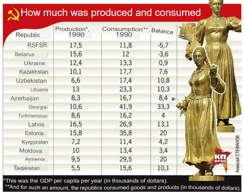 Here’s an example of what I mean. These charts show each SSR country’s input vs. output into the USSR in terms of their consumption vs. production; in short, it shows which ones carried their own weight, and which were subsidized by ‘mother’ Russia.
