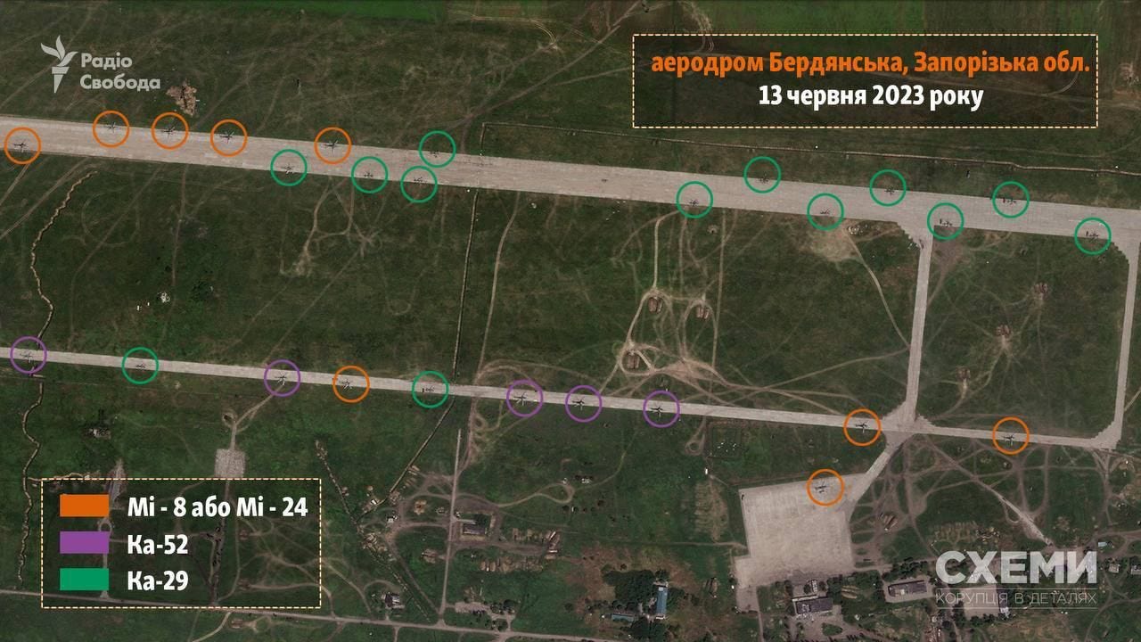 Interesting new satellite footage of Russia’s airfield in Berdiansk shows a huge increase of rotary attack craft brought up just before the start of UA’s June offensive: