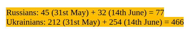"So the number of body exchange in this and the last one is: Russians: 45 (31st May) + 32 (14th June) = 77 Ukrainians: 212 (31st May) + 254 (14th June) = 466"
