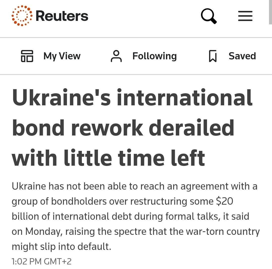 Reuters writes that in late summer - in August, Ukraine may default on international bonds. The deferral of payments, which started in 2022, ends on August 1, and creditors refused to make a debt restructuring in the amount of $ 20 billion-pay up. Most likely, the Americans will come up with something to smooth out the consequences of this crisis.