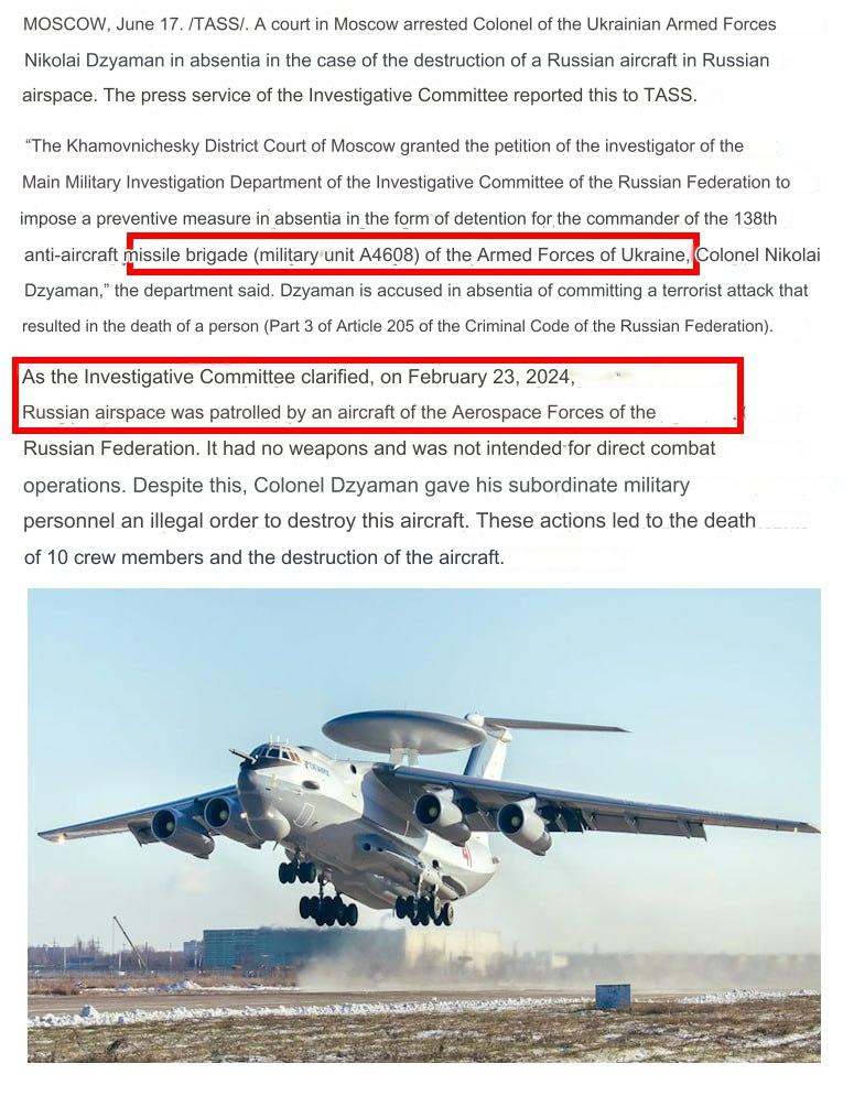 A couple caveats: firstly the Russian criminal report does not specify it was an A-50 specifically, but that is being inferred. But just for the sake of due diligence, there is no real evidence to this date that an actual A-50 was shot down though it does appear likely according to this.