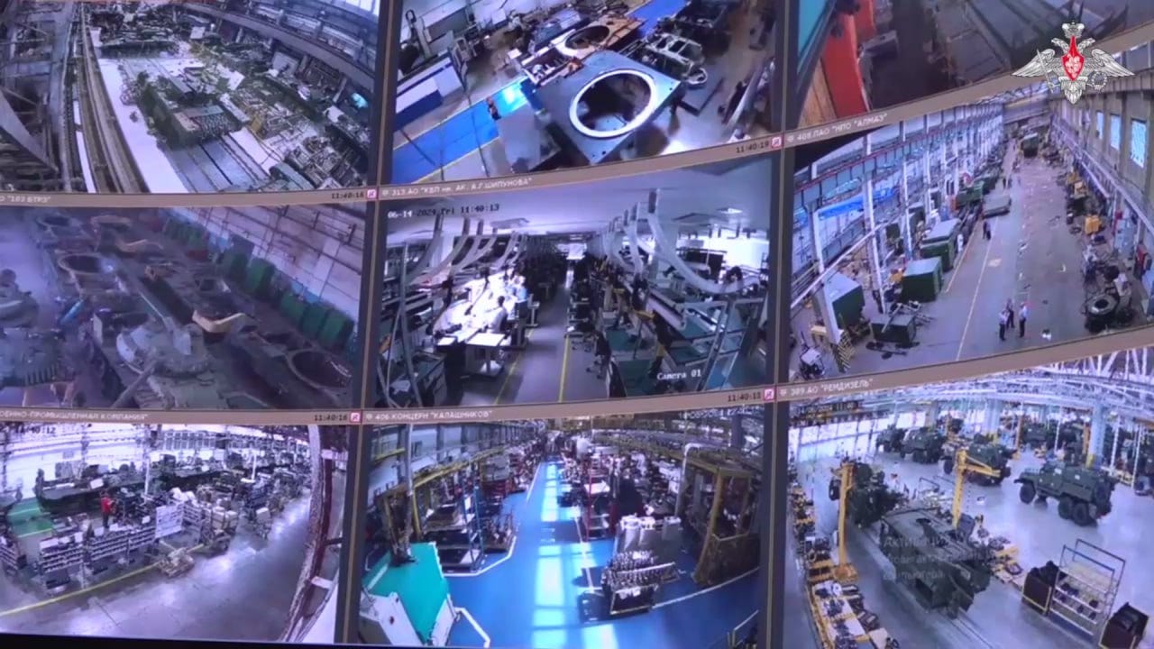 The importance of Russia’s tank and armor production and the smooth operation of the facilities cannot be understated if the MOD generals themselves watch the factory floors from their HQ all day long. On the top left is footage from Uralvagonzavod BMPT Terminator production line, as well as Atamanovsky Armored Repair Plant 103 with the refurbishment of T-62s, VPK Plant making 6x6 MRAPs, Remdiezel engine plant, and more.