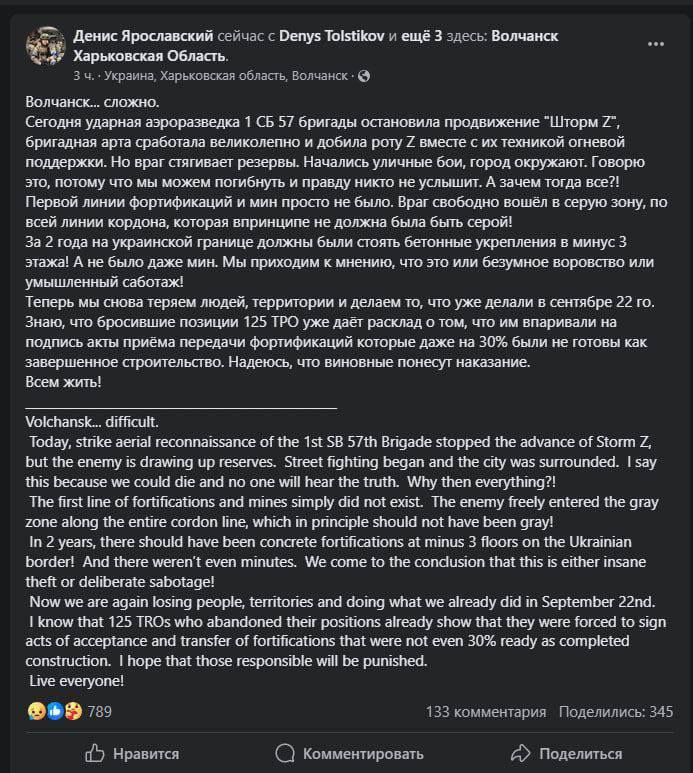 This panicked cris de coeur by a Ukrainian 57th Brigade account even lists the now legendary ‘Storm-Z’ penal troops as participating, while also naming the Ukrainian 125th territorial defense troops as abandoning their positions in Volchansk to flee: