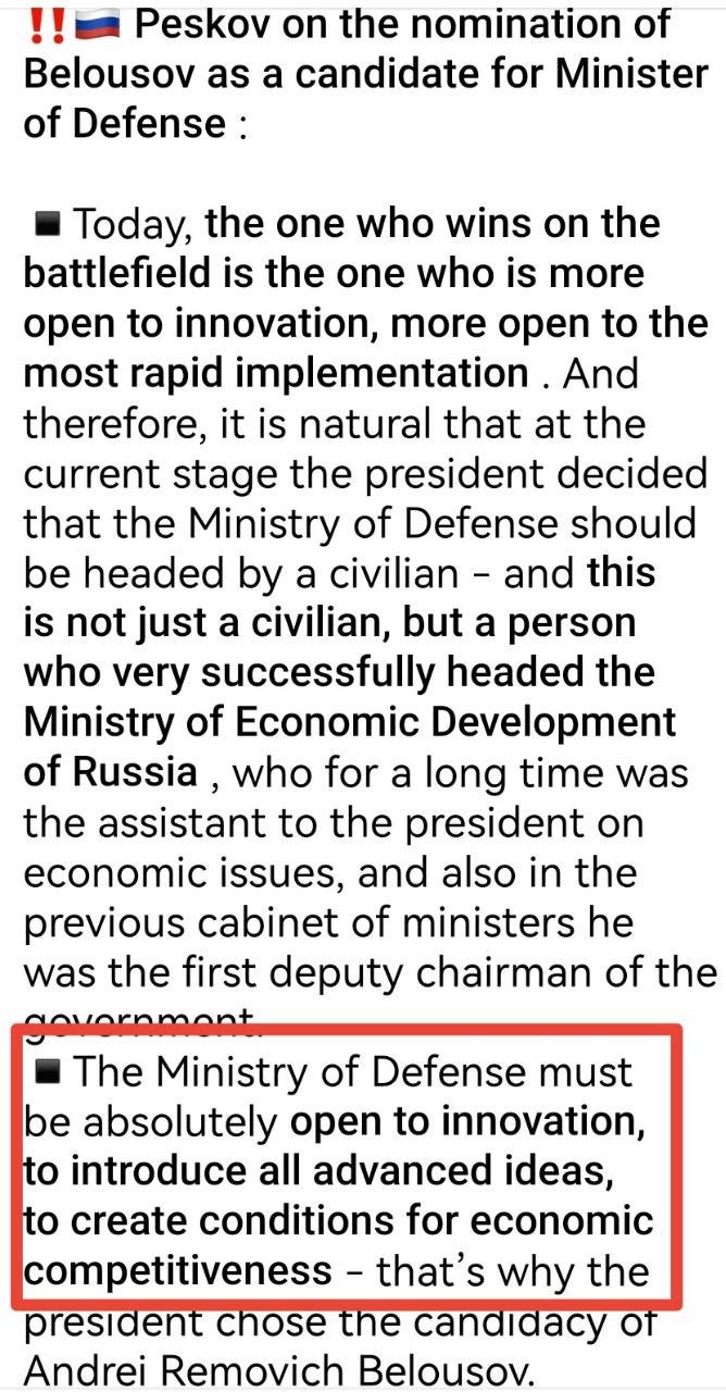 🇷🇺 Dmitry Peskov’s full commentary on the reasons for the appointment of Andrei Belousov as Minister of Defense