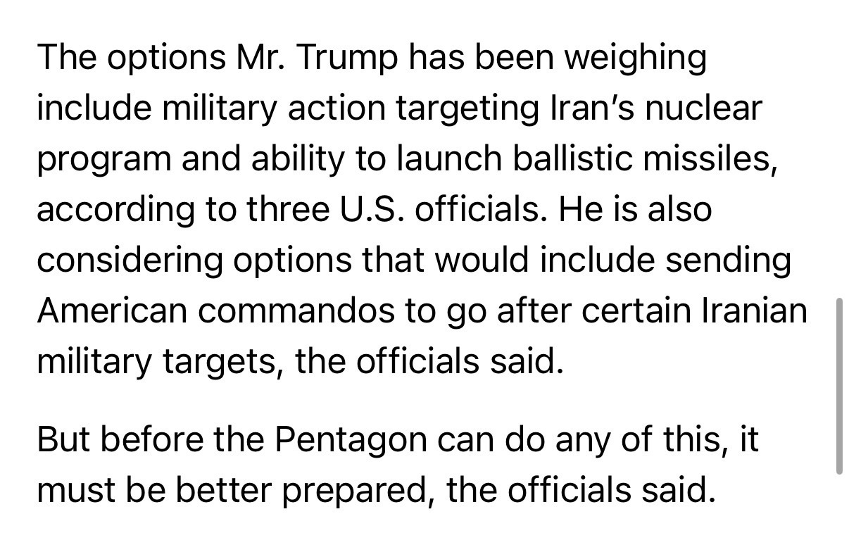 The options U.S. President Donald Trump has been weighing include military action targeting Iran’s nuclear program and ability to launch ballistic missiles, with U.S. officials saying he is also considering options that would include sending American commandos to go after certain Iranian military targets. - NYT
