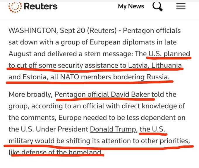 He grudgingly mentions the news that Trump has quietly cancelled a multi-year defense training program with the Baltics, which had recently been reported: