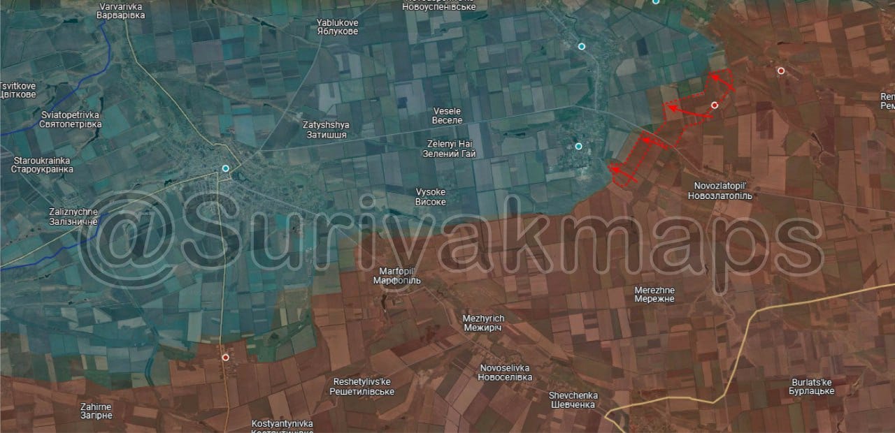 Even further southwest from there Russian forces expanded toward Malinovka, which I reported on last time. They are slowly building up the flank for an eventual enveloping pressure on Gulaipole: