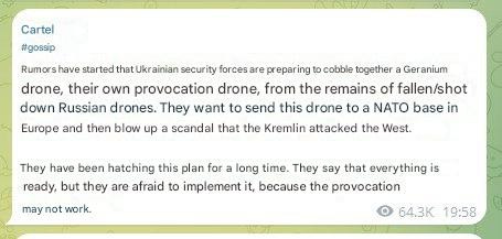 "Post from 09/08/2025 on the "Cartel" channel warning about the preparation of a provocation involving the sending of "pseudo-Russian" UAVs to the West. Actually, the plan was already carried out on September 10."