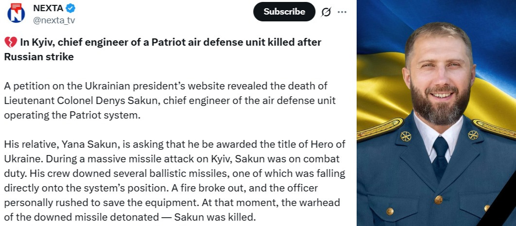 "The downed debris from a ballistic missile was heading toward his Patriot battery, he rushed to put out the fire but then the warhead of the downed Iskander exploded."