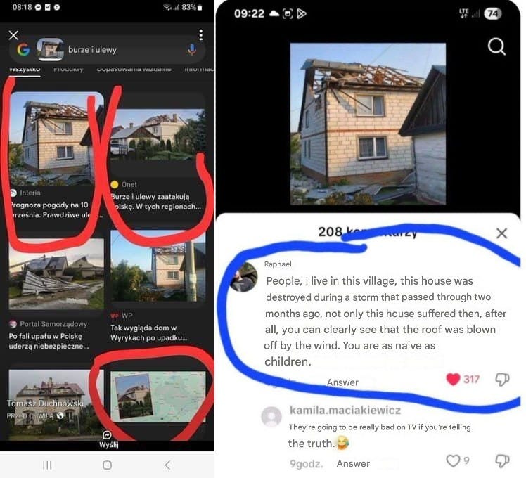 Additionally, Polish homes presented as “destroyed” by Russian drones were outed by citizens as houses that were damaged long ago by natural disasters: