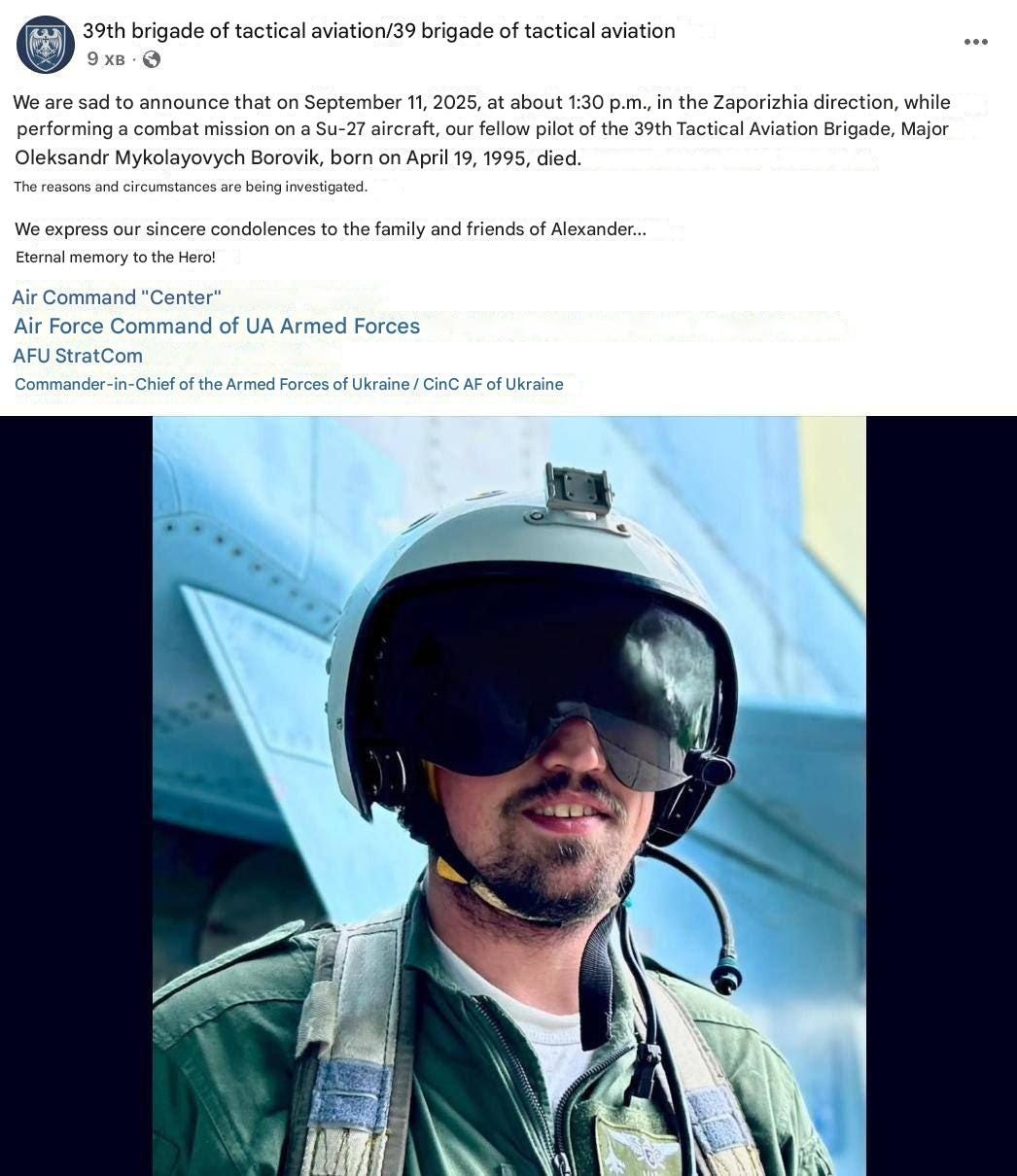 Today during a combat mission, a Ukrainian Su-27 aircraft crashed – Major Oleksandr Mykolayovych Borovyk, a pilot of the 39th Tactical Aviation Brigade, died. -- AFU