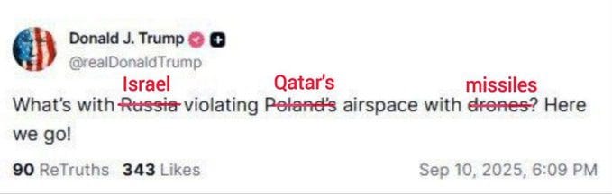 Sure, he professed ‘disagreement’ with Israel’s strikes on Qatar prior to that, but he didn’t quite react with the same faux-outrage; that’s not to mention the US having admitted having foreknowledge of the Qatar attacks, which implies a kind of tacit approval of them.
