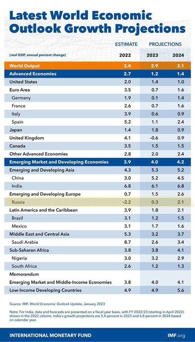 As can be seen on this chart, the IMF now forecasts Russian economy to grow in 2023 rather than contract (which was the previous forecast), and in 2024, it expects GDP growth of 2.1%. That might seem small, until you look at their forecast for the leading Western nations: 1.0% for U.S., 1.6% for the entire Euro area with Germany at 1.4%, France at 1.6%, Italy and UK at 0.9%, respectively, etc. That’s quite contrary to the typical low-effort propaganda flung around by Russophobes in the twitter-sphere and elsewhere.