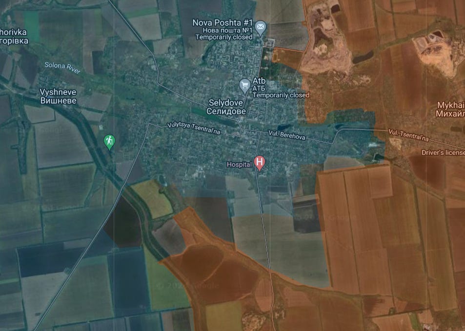 So now, we’ve had the usual incremental advances in the known areas: for instance toward Kurakhove, more areas north of Ugledar captured, around Selydove in the Pokrovsk direction—which town is being slowly enveloped in a cauldron: