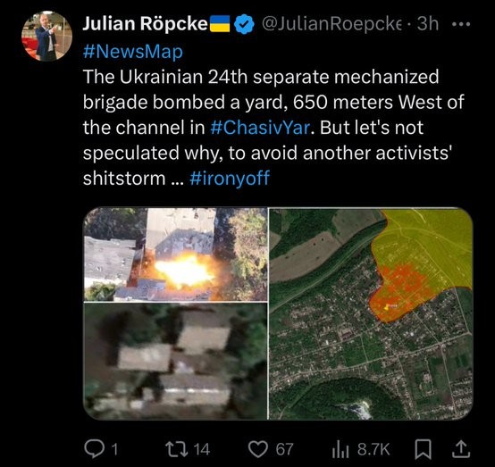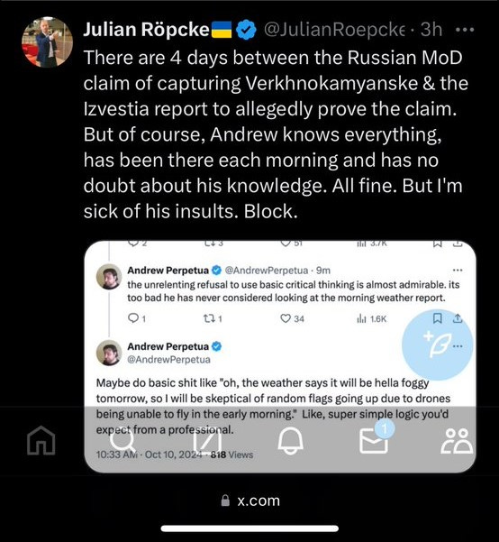 There’s a surge of infighting on the pro-Ukrainian social media spaces, with figures like Roepcke having blocked others like Andrew Perpetua amid all-time high disillusionment and anxiety.