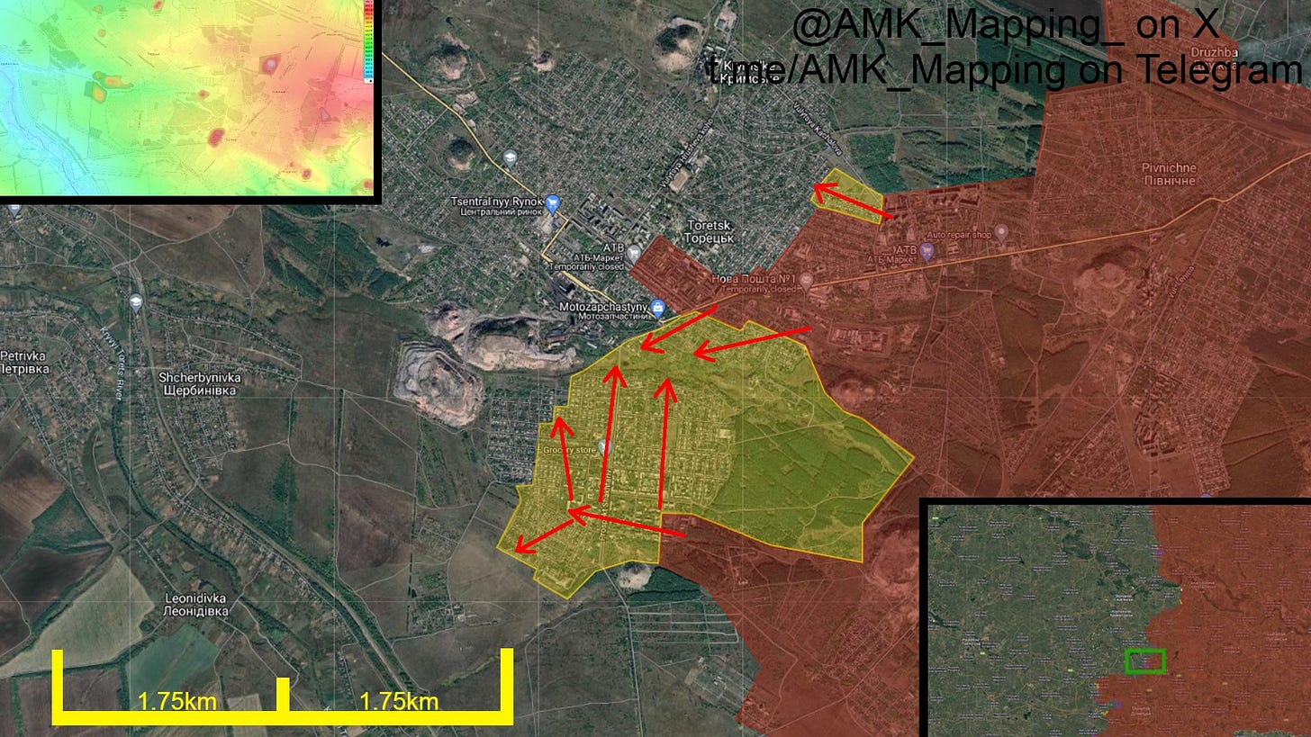 Consolidation and deep advances into Toretsk, which appears nearly 50% captured. As well as more small breakthroughs into Chasov Yar.