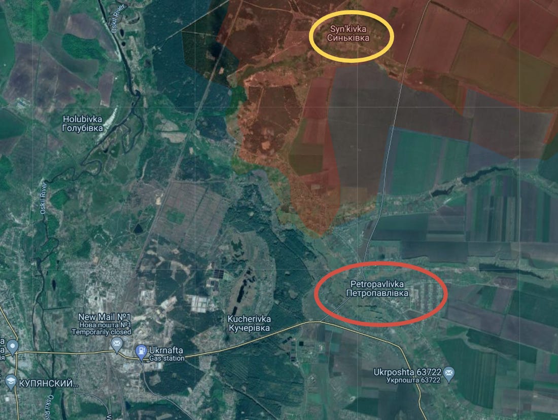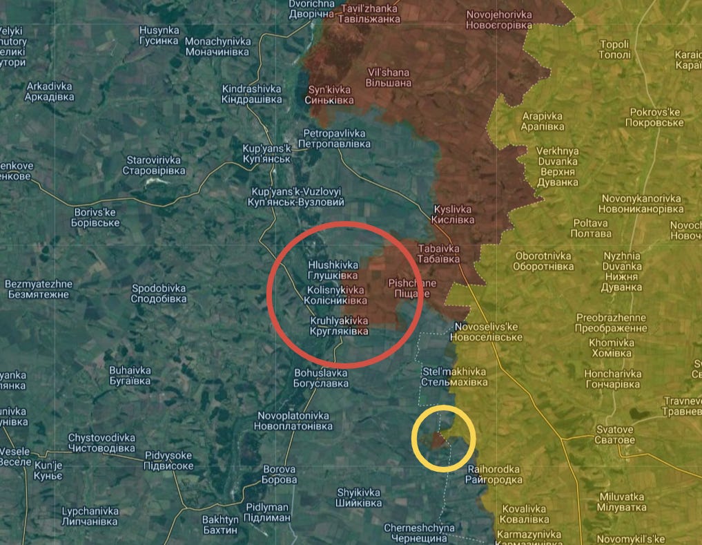 There are many other small advances made in that region, including Vyshneve to the south (circled in yellow) and the whole area circled in red, which is turning everything between there and Sinkovka into a giant cauldron trapped against the Oskil River: