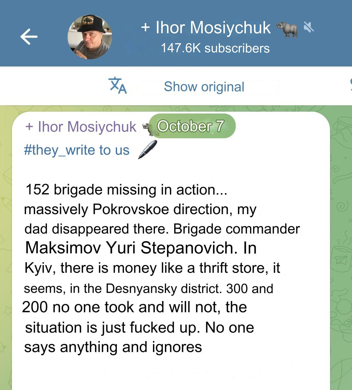 Meanwhile, videos have begun to appear of family members’ pleas toward their missing servicemen. Here a daughter of a soldier from Ukraine’s 152nd says hundreds are missing in the Pokrovsk direction: