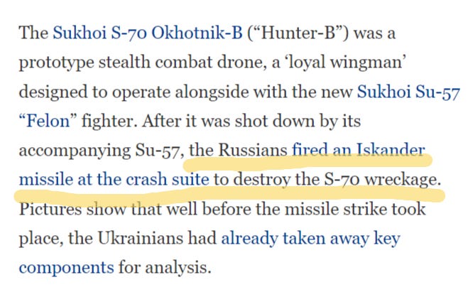 As an update to my last report regarding the shoot-down of Russia’s S-70 Ohotnik drone, unverified news later came that Russia did in fact raze the crash site with an Iskander missile. Perhaps they waited until military engineers had arrived on site rather than shooting at it immediately, or perhaps it merely took them time to establish the exact coordinates and organize an attack.