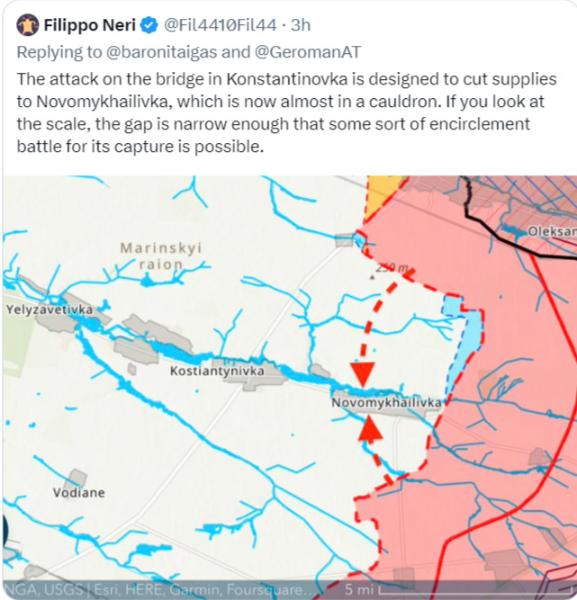 As a last frontline update, Russian forces are also slowly encircling Novomikhailovka, on southern side of Donetsk opposite of Avdeevka. There they’ve hit a key bridge in Konstantinovka nearby which cuts supplies to Novomikhailovka: