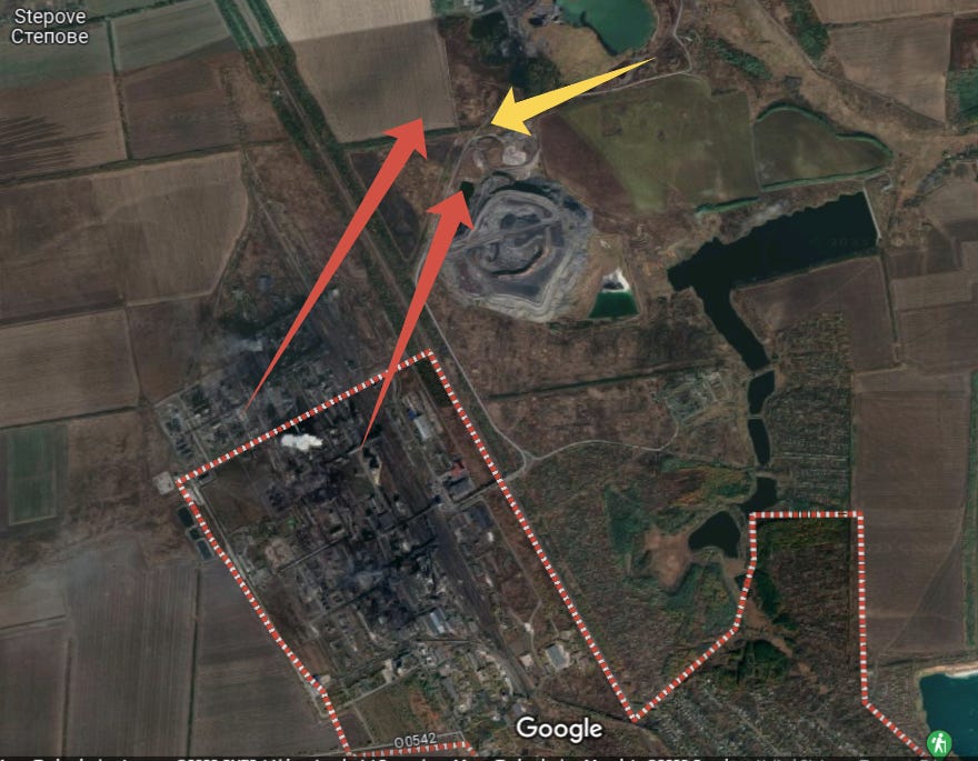 Here you can see the giant industrial plant just south of the big Slag Heap. The red arrows represent where AFU is firing from their very hardened positions in the industrial complex, the yellow arrow where Russian forces are trying to break out of: