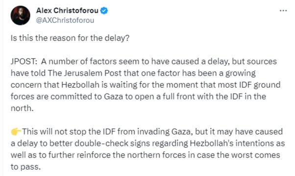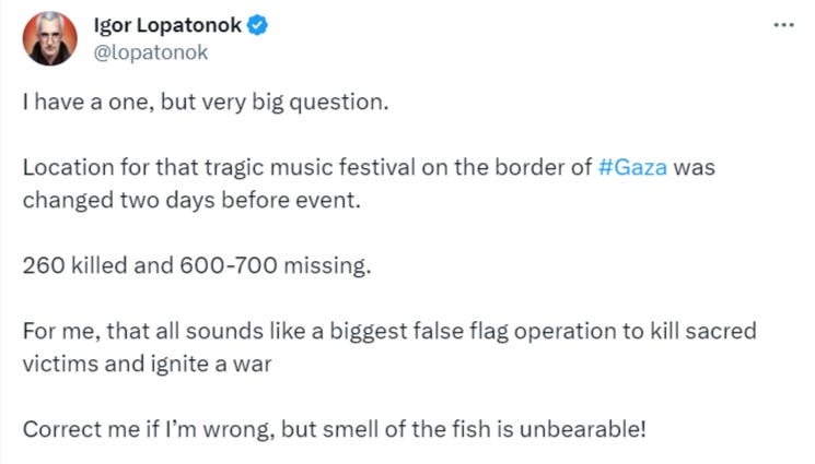 As a last note on the Israeli situation, this Israeli woman claims that her sources confirmed that Netanyahu issued a deliberate 7 hour ‘stand down’ order to all IDF at the start of ‘Al-Aqsa Flood’. If true, this would confirm the entire thing being a Pearl Harbor and 9/11 style falseflag: