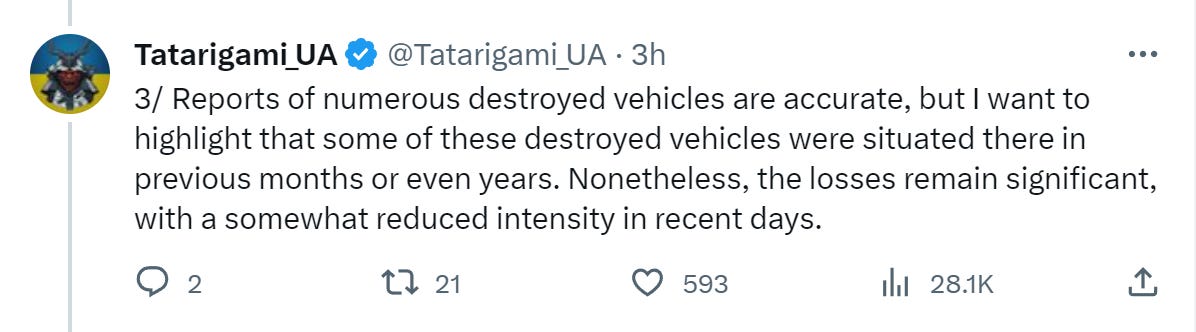 Funnily enough, despite the alleged losses, some sources claim the AFU’s losses are still even higher. This is unverified by me personally but is still interesting to note: