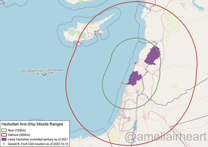 And for those wondering, this is said to be the current U.S. carrier position with the range of Hezbollah anti-ship missiles shown: