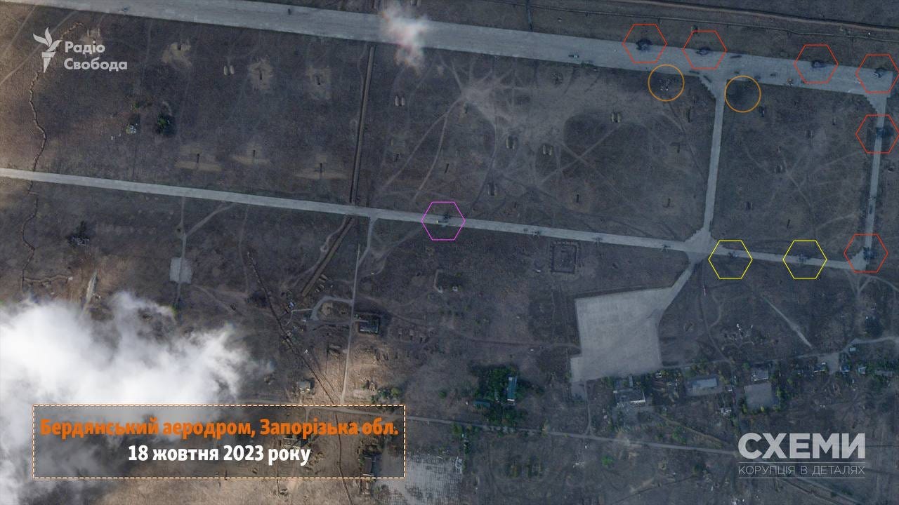 According to one pro-Ukrainian source, he thinks the red circles could be destroyed choppers while yellow are “damaged”.