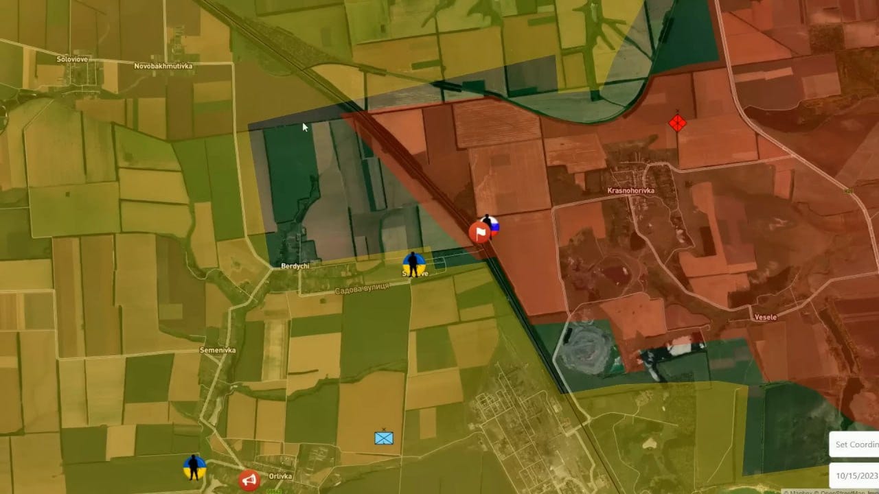 Here’s a somewhat reverse view from the industrial complex looking toward Russia’s positions near the yellow line: