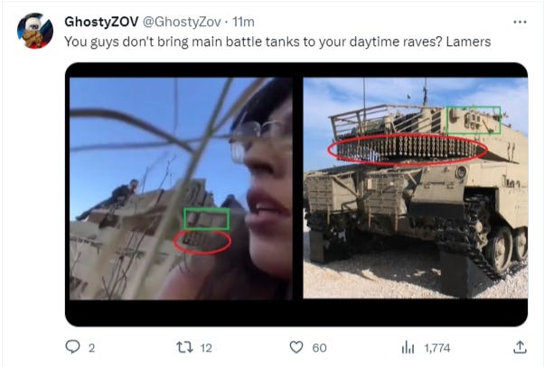 In the original footage, you can even see IDF tanks already there, with festival goers hiding behind them, which obviously calls into question the narrative that Hamas raided the innocent festival for the sole purpose of massacring civilians: