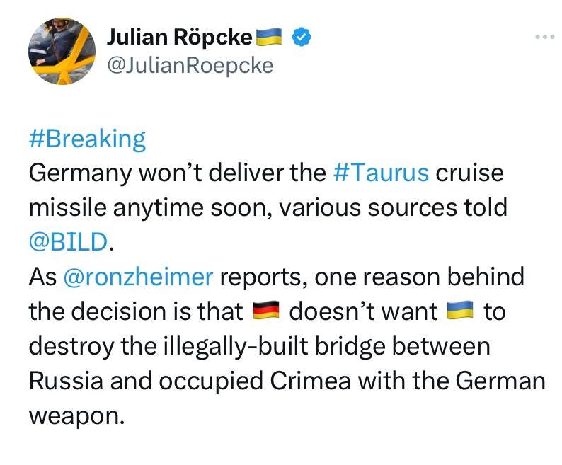 And now, it’s looking again like Germany has devastatingly chosen to reneg on the Taurus missile—part of the long ongoing game I described last time which saw U.S. reneging on ATACMS, causing Germany to get cold feet as a result.