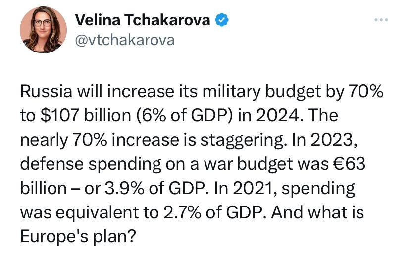 At the same time, Ukraine is terrified that Russia is increasing its production and defense funding to historic levels: