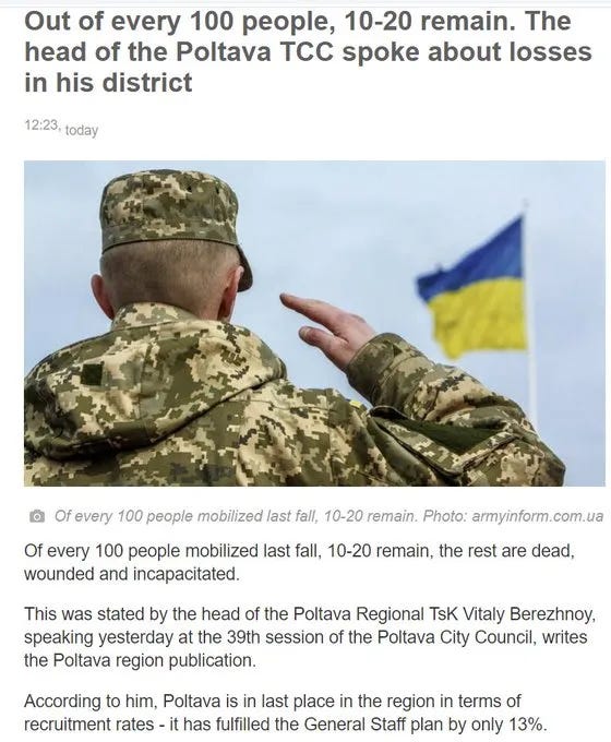 Sticking with the 90% theme, recall that here I previously proved how 90% of the Poltava region’s mobilized were destroyed, as per their own commissariat, which can be extrapolated out.