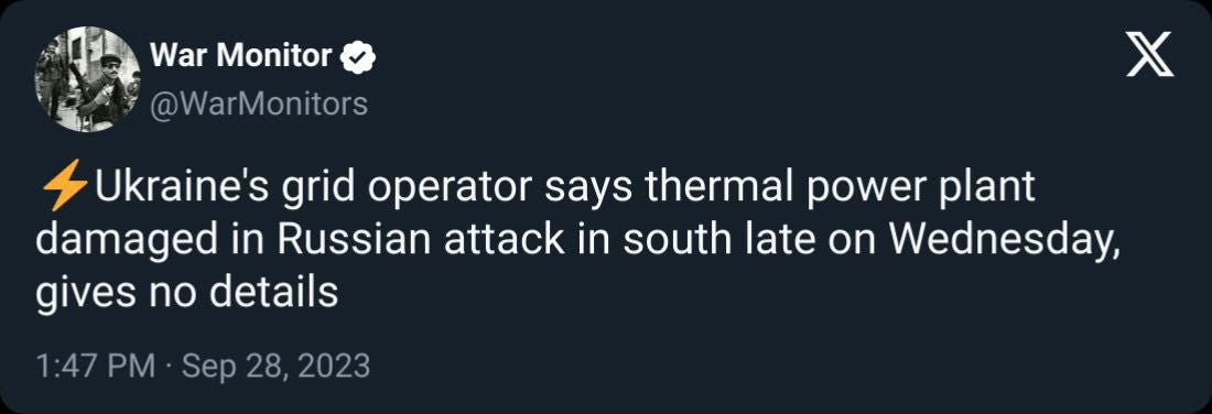 Ukraine has begun stockpiling transformers out of country, likely in Poland and other friendly states, to have them on call to repair incoming damage to power facilities. However air defense seems more depleted than ever, with Patriots never being heard from again after they were struck by Kinzhals, so it remains to be seen how much Ukraine can protect any of their key facilities. One thing’s for certain, Russia has not used that many missiles lately—relying more on Geran drones—and thus has likely stockpiled a huge amount for the fall-winter period.