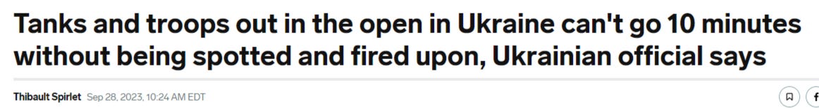 Business Insider writes that Ukrainian assets can’t go longer than 10 minutes without being struck, a new riff on the old famous revelation that Ukrainian soldiers’ life expectancy on the Bakhmut frontline being measured in moments: