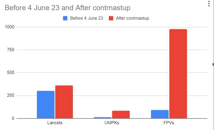 Here’s a chart showing Russian drone (Lancets and FPVs) and UMPK glidebomb usage before the counteroffensive (blue) and afterwards (red):