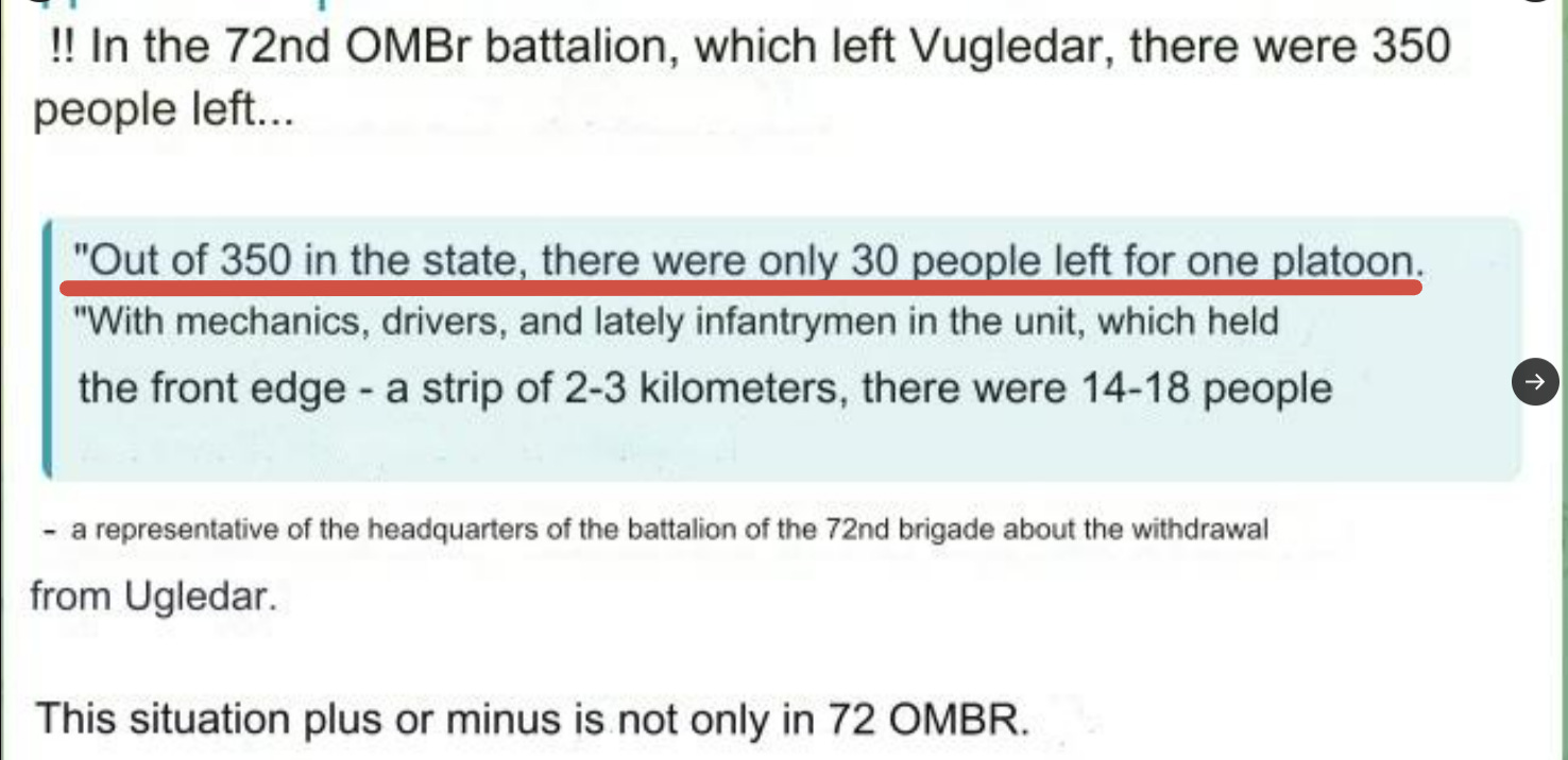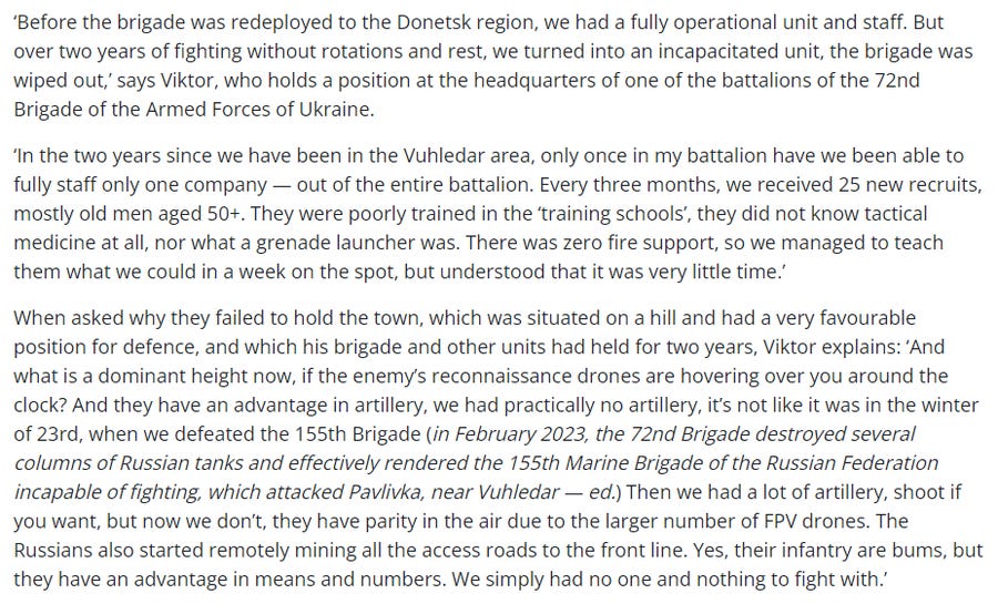 The most harrowing were from Ukraine’s 72nd Brigade, which was the chief garrison at Ugledar. This brigade was almost entirely annihilated, and the stories coming out directly from its troops are shocking.