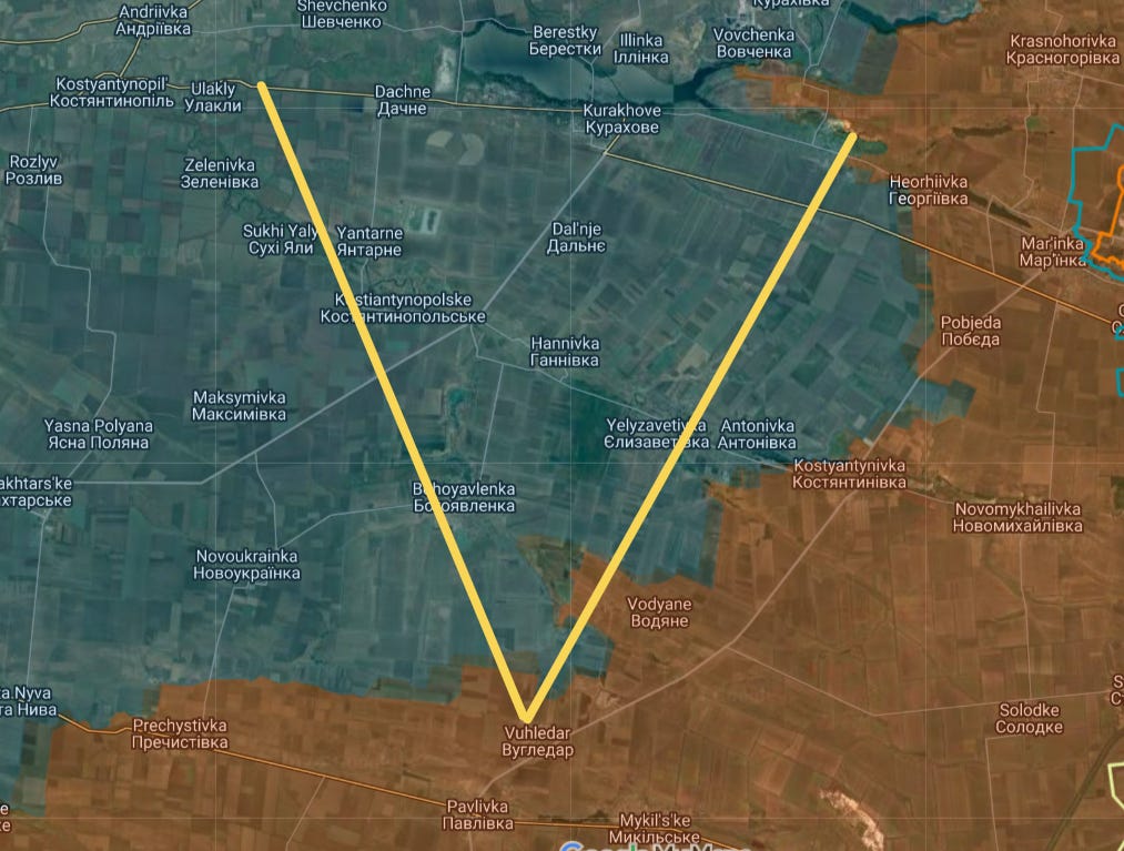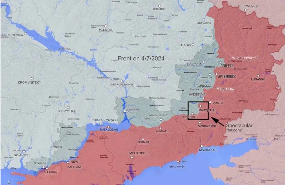 The map shows the front line on 7.4.2024, it clearly shows how dangerous the Ugledar balcony was operationally. The second map shows how this ledge prevented the use of the powerful Soviet double-track.