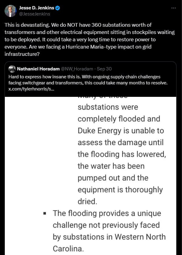 But the truly egregious irony here goes as follows. Remember that wee little hurricane in the Appalachias? You know, the one that devastated the entire region this past week? Well, energy systems engineer Jesse Jenkins remarked on the devastating nature of the situation as much-needed substations are missing after the entire energy grid in the region was flooded and destroyed: