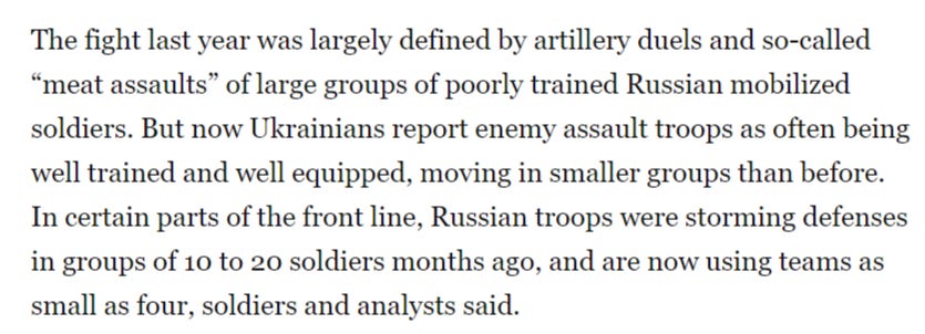They cite the usual: small Russian units embedding themselves discreetly which makes it difficult for Ukraine’s drones, artillery, etc., to hit these small, fast-moving fire teams. But another major admission is that Russian battlefield communications have reportedly seen vast improvements.