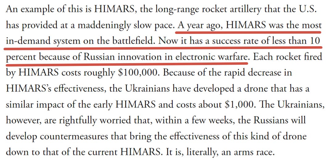 HIMARS has been reduced to a measly pittance of 10% effectiveness due to Russian EW. And it’s true from the observer perspective, HIMARS is hardly seen on the battlefield anymore. Sure, there were a couple strikes here and there the past month, but it’s down to about 2-3 notable strikes a month these days, maybe less.