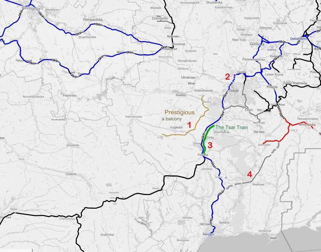 For those who don’t know, the ‘Tsar Train’ referenced above was a massive 32km line of train carts—hundreds, if not thousands of them—which Russia positioned along the section of track shown in the map as a giant fortress wall and bulwark against potential Ukrainian invasion. Now this entire railway line can potentially be unblocked, opening a direct new communication/logistics route from the Donetsk region to Mariupol.