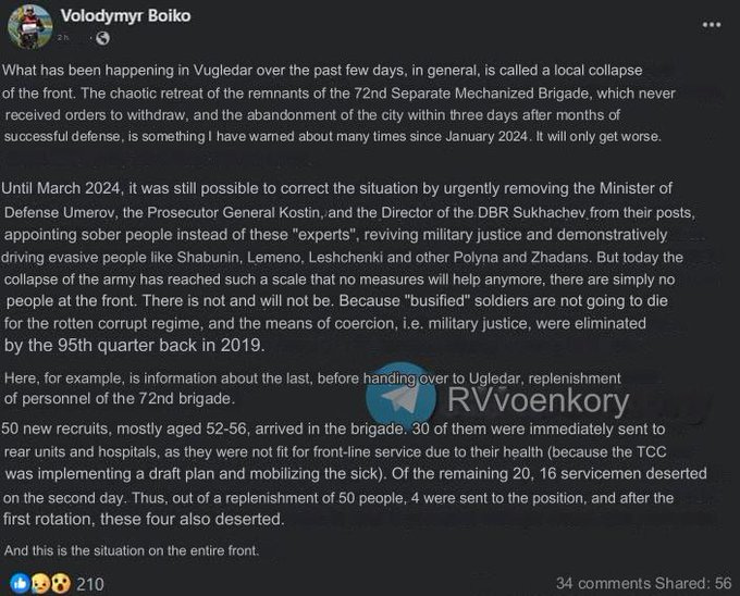 "It will only get worse. Until March 2024, it was still possible to fix the situation, but today the collapse of the army has reached such a scale that no measures will help - there are simply no people at the front. There are not and will not be. Since the "busified" soldiers are not going to die for the rotten corrupt regime, and the means of coercion - that is, military justice - were eliminated by the 95th quarter back in 2019," writes Boyko. RVvoenkor