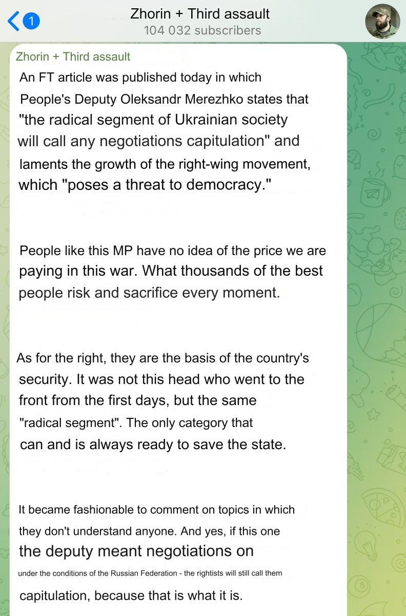 A senior Azov movement figure, Maksym Zhorin, says that yes indeed they will and calls the far right “the foundation of country’s security”. Zhorin is the deputy commander of the 3rd Detached Assault Brigade, an elite unit under the political control of the far right Azov movement. For Azov movement and multinational securocratic interests behind it, the war is a lucrative business - an enormous pie they are sharing with the Russian siloviki mafia. They are not going to give it up easily.